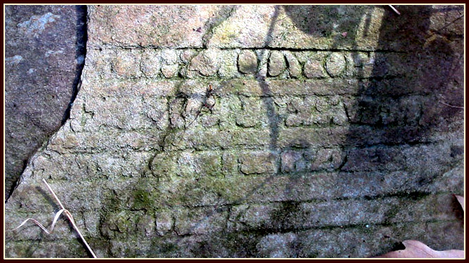 Believing land records had pointed me to the old Baptist church, I contacted the land’s present owner and was graciously shown the way to what I sought. Followed by an inquisitive herd of cattle, we walked a grassy ridge that provided panoramic views of surrounding pastures and the distant Rocky River basin. Rising to the north, and flowing around the land, was a spring head identified in early deeds as feeding “Meeting House Branch.” Eventually we reached an ancient hilltop cemetery in a small grove of trees. Though well taken care of, time and life had taken its toll on the graveyard. Just a few stones revealed readable words such as “the” or maybe “here.” The following is a digital image of the only surviving stone with words crying out to be deciphered.