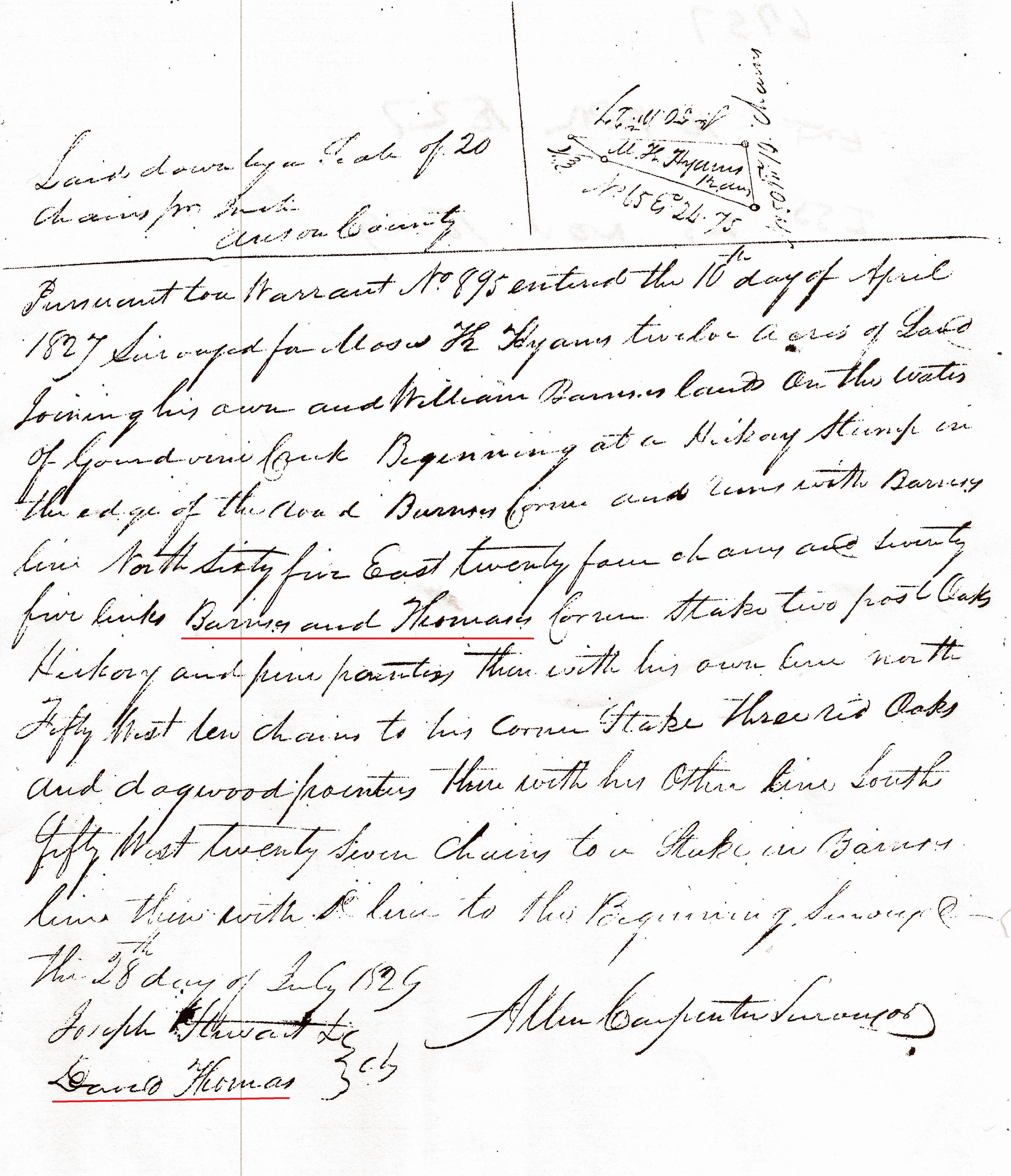 “My ancestor, David Thomas served as chain carrier in the 1829 survey (see above) for 12 acres issued to Moses K. Hyams. The survey indicates the land adjoined that of Thomas and Barnes. Looking for more on Moses, I found nothing. However, early family history wrongly identifies David’s uncle Ezekiel Thomas as marrying Charity, the daughter listed in the Anson County will of John Hyames/Haynes. The marriage could not have happened as the dates made it impossible. What a consequence, or am I missing something?”