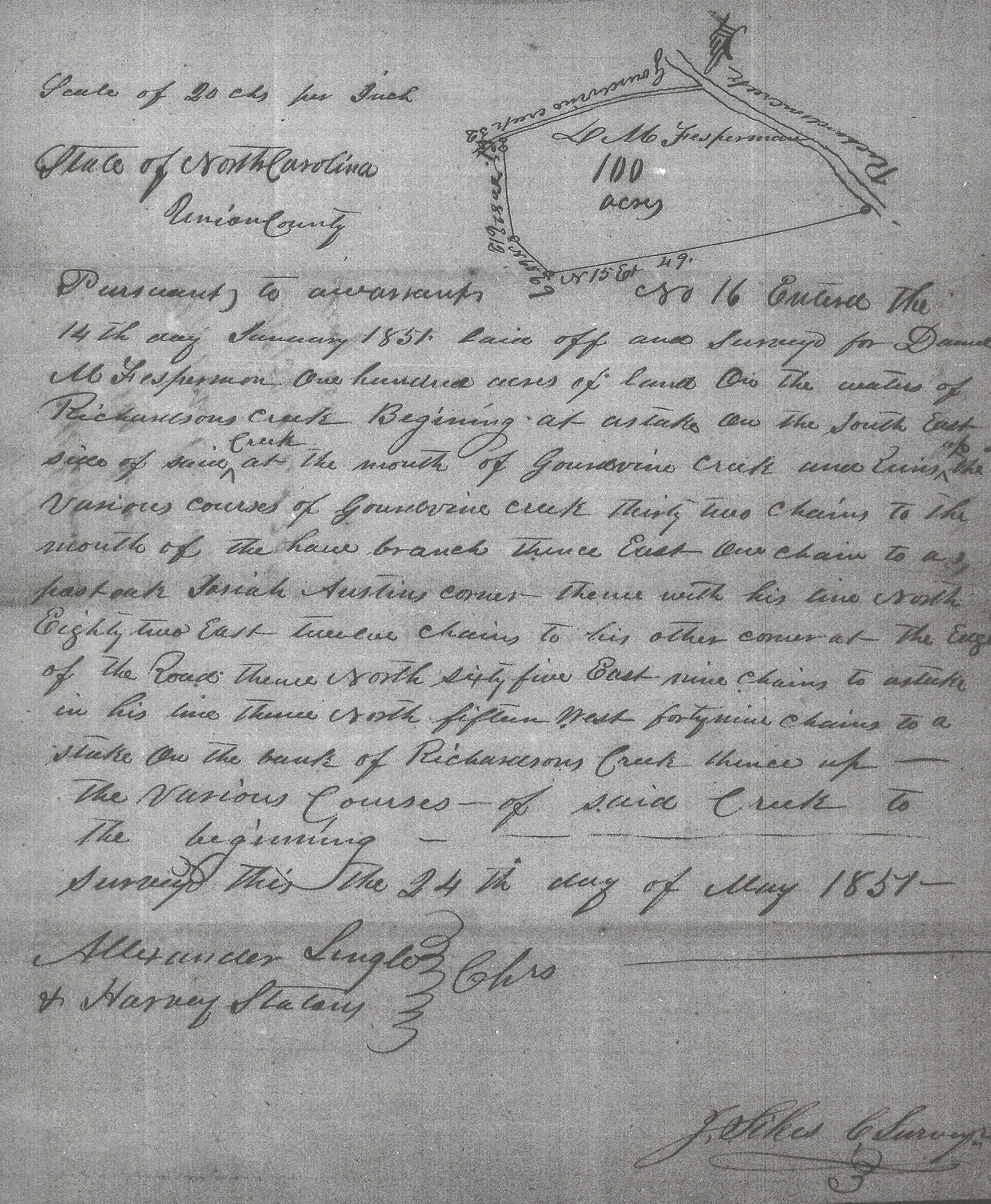 On 29 May 1851, Daniel M. Fesperman was issued a grant for 100 acres along the east side of Gourdvine Creek. The survey clearly takes in the 12 acres issued in the 1820’s to Moses K. Hyams. This land adjoined Ananias Thomas and Josiah Austin. A search of D. M. Fesperman netted the following article published 23 May 1911 in the Monroe Journal: