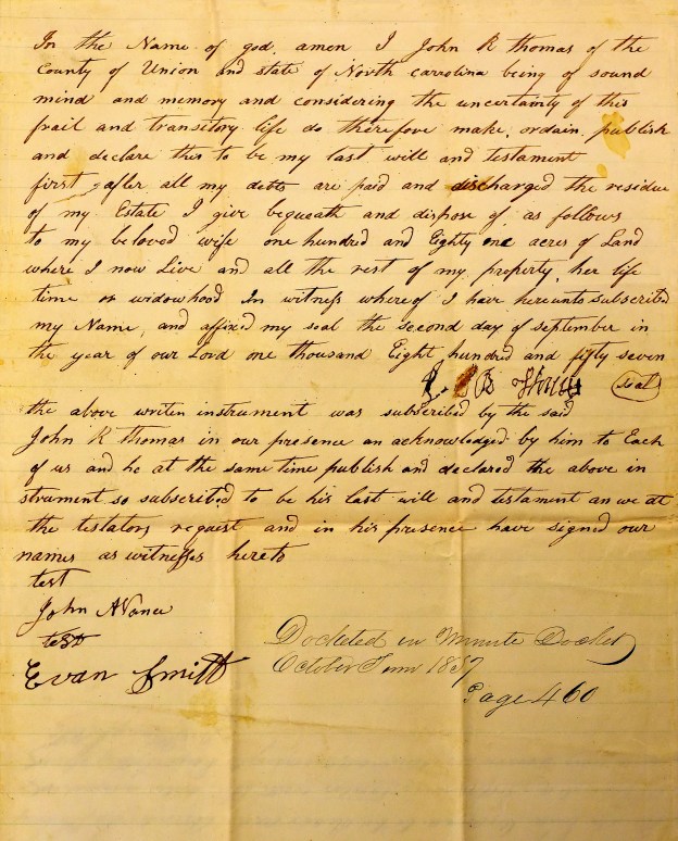 On one such visit we explored the life of John Robert Thomas, brother to my own ancestor David Thomas. Born in 1816, the son of Ananias Thomas, John married Annis Nance 2 Dec 1846. John’s life record is relatively short, with hints of legal troubles. He purchased land near Rocky River in the vicinity where Annis was raised. John wrote his last will and testament in 1857 and died prior to its probation a year later. Land and court records show that Annis continued to live in the area until or near her death. She’s buried at Oakwood cemetery in Concord near her son Clement Marshall Thomas. John and Annis Thomas also had a son John Calvin who’s buried at Big Lick Baptist not too far from my grandfather’s farm in Stanly County.