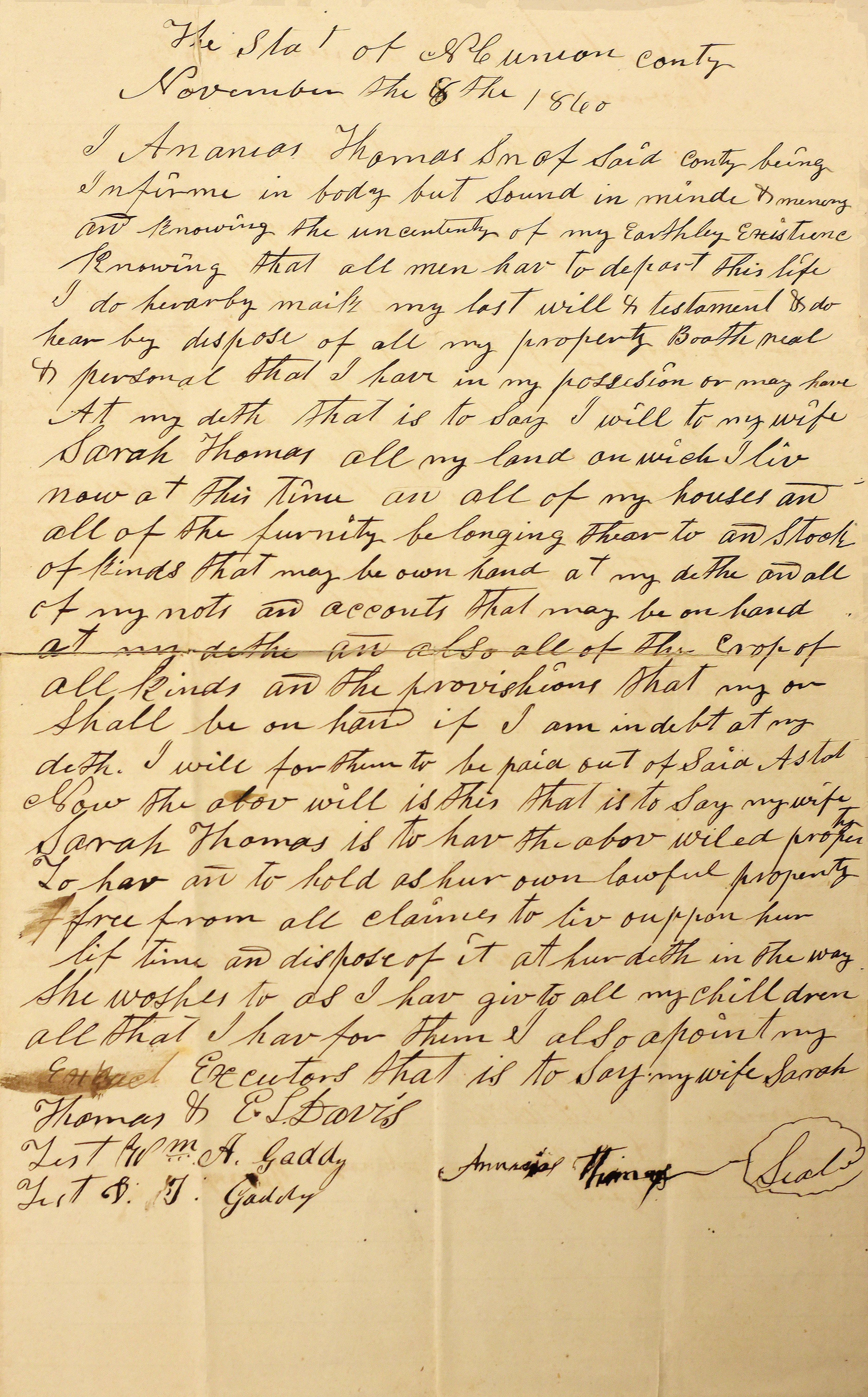 Rather than fill you with more computer generated font, below are images of Ananias’ last will and testament along with his wife Sarah’s estate papers. Take a look, imagine the shaky old hand using a quill pen to sign his last living directive. Read and imagine what kind of man he was. And look through Sarah’s papers and see if you can find your way back to Ananias and Sarah.