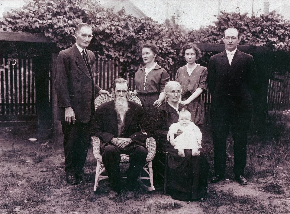 back row (l-r) Hezekiah Boles Billingsley, Mary Alice Thomas Billingsley, Katherine Billingsley Riddle, George Barber Riddle; front row – John Milton Thomas, Sarah Elizabeth Redfearn Thomas with baby George Barber Riddle, Jr.