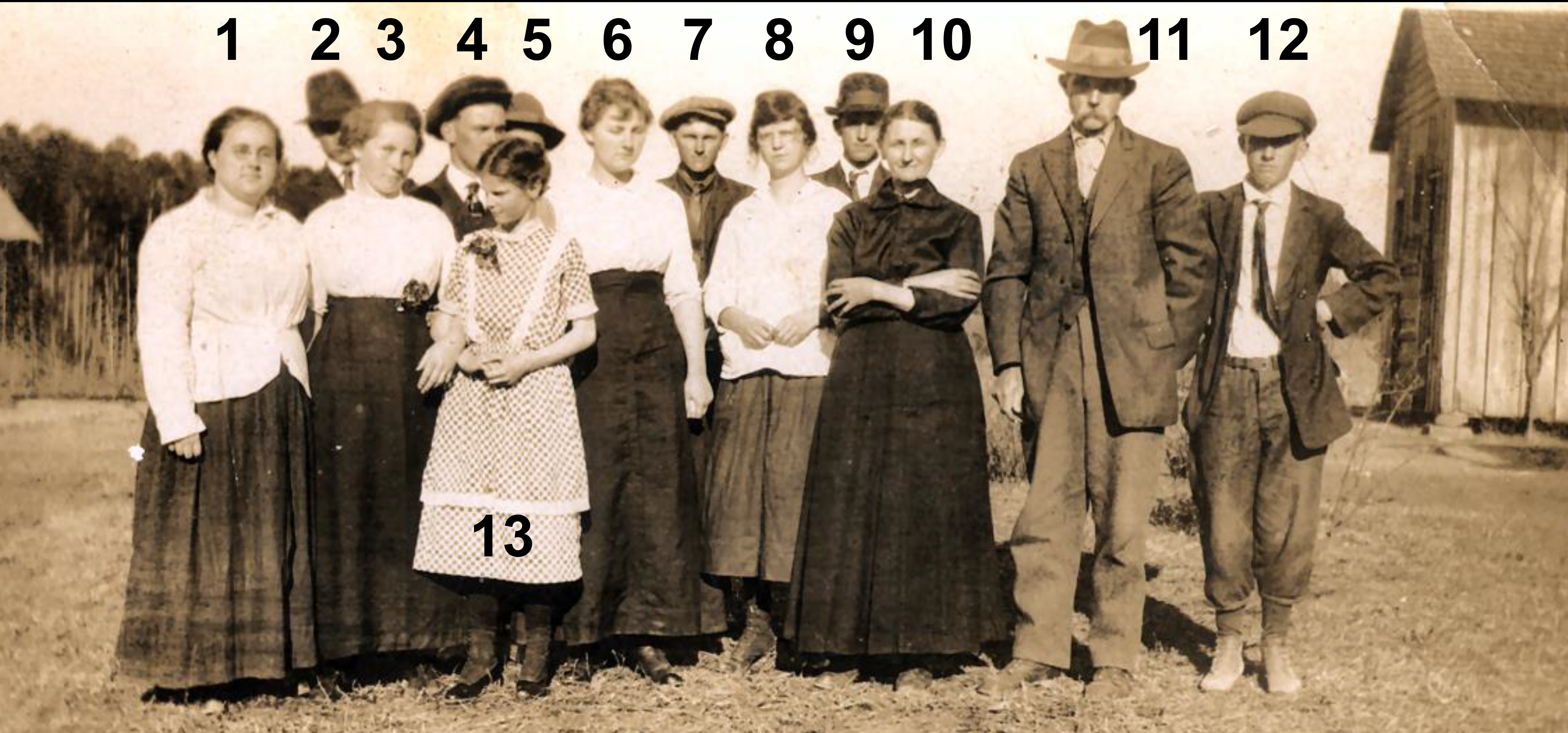 The Burris Family: (1) was thought to be Sally though a grandson states this could not be her (see post comments) – Jack Burris’ wife, (2) Noah or Green Burris (brother of John Adam Burris, (3) Ola Burris, (4) Jack Burris, (5) Noah or Green Burris, (6) Ellen Burris, (7) Jesse Burris, (8) Allie Burris, (9) Dave Burris, (10) Sophia Lucinda Coley Burris (wife of John Adam Burris), (11) John Adam Burris, (12) Ivey Burris, (13) Zula Burris