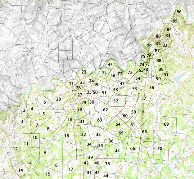 • Grant 150, Union County NC, ent. 14 Jan 1851, iss. 29 May 1851.(Shaded Red) Issued much later on top of prior grants causing an important legal battle reaching all the way to the Confederate States of America Secretary of War. Issued to DANIEL M. FESPERMAN, being 100 acres on Richardson Creek beginning at a stake on the south east side of said creek at the mouth of Gourdvine Branch and up the various courses of the branch 32 chains to the mouth of Haw Branch, then east one chain to a post oak Josiah Austin’s corner, then with his line north 82 east 12 chains to his other corner a the edge of the road, then north 65 east 9 chains to a stake on the bank of Richardson Creek, then up the various courses of saud creek to the beginning. Chainbearers: —-