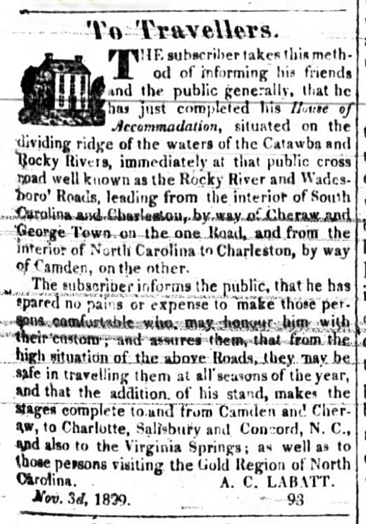Dated 3 Nov 1829, A. C. Labatt placed the following advertisement in the Western Carolinian. To me it’s perfect! Apparently Abraham built a very nice “House of Accommodation” located on what I know must be the old Charleston Highway. Following present day Hwy 601 north into Cabarrus County, it turns a bit taking Mt. Pleasant Road to the crossing of Rocky River at Hagler’s ford. Along the way, in early Mecklenburg County grants and deeds, there are several locations this road traveled where it was identified as being the “Charleston Road.” And, upon crossing the river towards Concord, the road became known as the “Dutch Road” and earlier the “Indian Path.” And, in the advertisement, the other roads are identified as the Rocky River Road and Wadesboro roads. One of these might be the present day Hwy 200 or 601. The other would have been the road running possibly from Charlotte to Wadesboro. Abraham Labatt also mentions the gold country as well as Virginia Springs. That’s a new one for me!