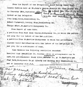 Accompanying the speech and other papers is a typed transcription of the relevant portion “from the report of the Evangelican Tennessee Synod their fourteenth Session held at St. John’s church, Lincoln Co. from Monday 9th to Thursday 18th, September 1833.” The document establishes congregational support for the early efforts of Rev. A. Miller. Also included in the file are photo copies of what is likely the original founding minutes from Flat Rock Lutheran church. First, below is the church session report from Lincoln County. The minutes of Flat Rock follow.