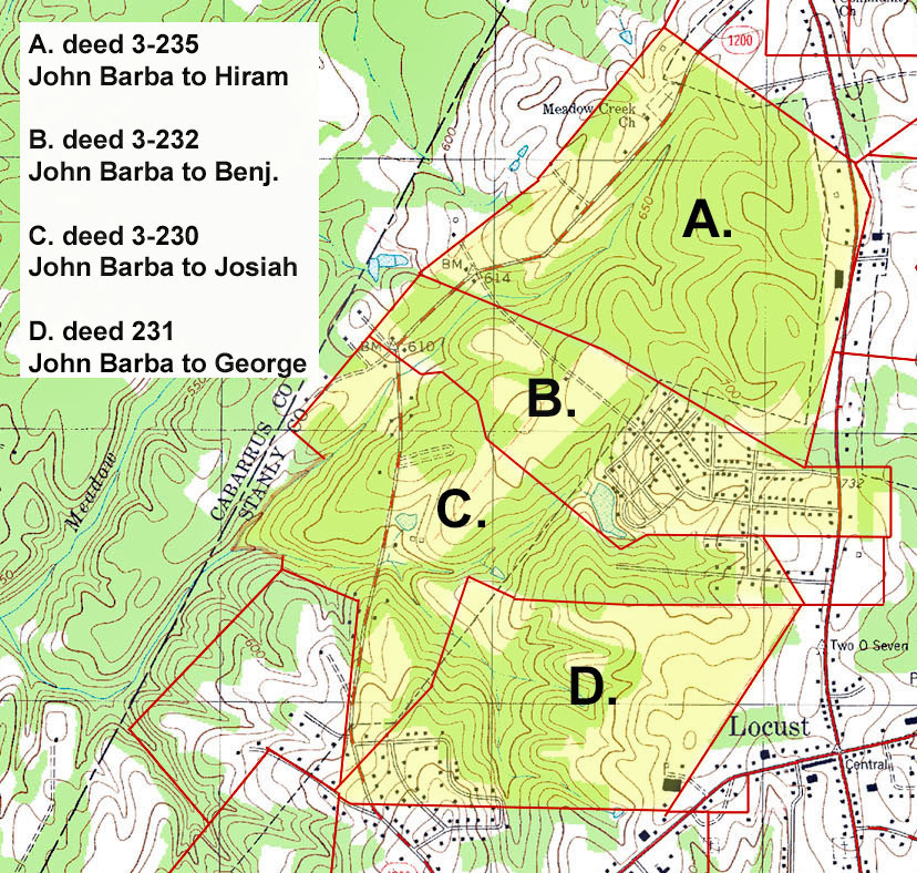 And then during the early 1850’s John Barba deeds his lands to his sons. Located north and west of present-day Locust. There is no deed or grant of origination for the lands of John Barba.