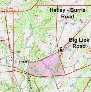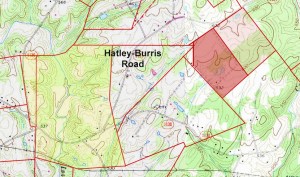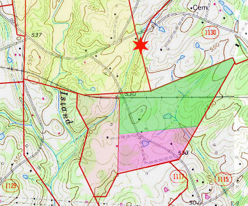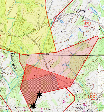 In 1843, Holden Hartsell received a land grant for 100 acres on Island Creek (Grant 48, Montgomery).  Taking in all the dark red shaded area above (including the checkered area), the tract at that time joined Peter Pless land to the north and George Cagle to the west. Its lines also ran along the “the old Polk Road” between two points marked with black stars.