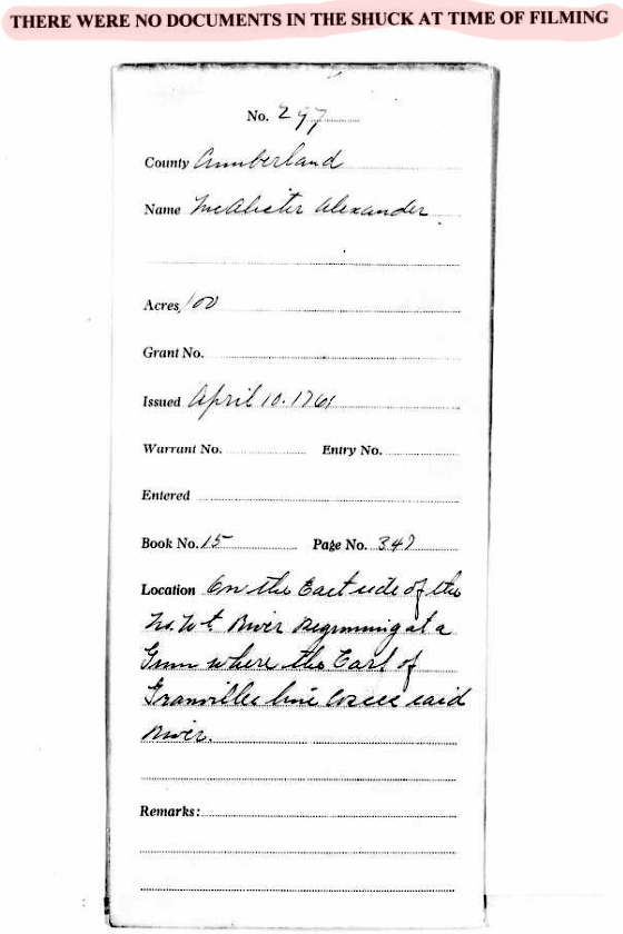 Sometimes the supporting documents were lost and never found with only the original entries in the patent books surviving. Of course you can’t place the patent book into a shuck so somehow the discrepancy needed to be communicated. In such cases of missing record, as appears to the right in the microfilm image of the shuck for the above Alexander McAlister, the patent entry for that particular grant was given a file number along with a brief description abstracted from the patent book. But of huge disappointment to people like me on the search, notice the red highlighted statement at the top which reads: “THERE WERE NO DOCUMENTS IN THE SHUCK AT THE TIME OF FILMING.”
