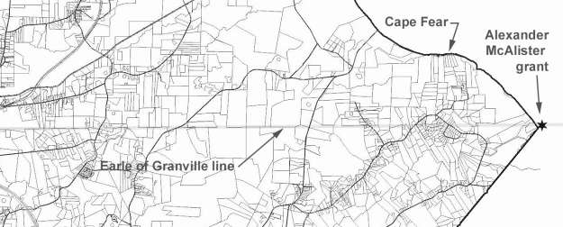 How cool is that! Not seen in any index or other format, and being lost as were many other grant documents from the time and area, Alexander McAlister’s original paper copy passed from his hand through successive owners before finally reaching the hands of Jonathan McGee Heck whose family wisely placed the papers at NC State Archives for preservation. The collection also holds the original 8 Nov 1761 deed of conveyance for this tract from Alexander McAlister to William Tully. Further title history for this tract is as follows:
