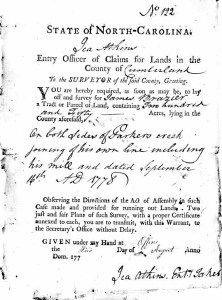 As with Alexander McAlister, James Brazier’s original copy of the actual survey passed through numerous landowners before finding its way to the collection of Jonathan McGee Heck. The actual survey goes further in depth than what was provided in the entry officer’s orders. The survey as seen below mentions the Granville line with the plat referring to the same as being “Brazier’s line”. Hugely important, the survey plat also identifies “John Burt’s line” to the north and “Anderson’s line” to the east. As for Anderson, a quick search of the Cumberland County Register of Deeds and land grant records at NORTH CAROLINA LAND GRANT IMAGES AND DATA, we learn that land grant no. 1437 to the east was issued in 1756 to John Anderson out of Bladen County. The grant was entered at a time before the formation of Cumberland. The shape and orientation of John Burt’s land to the north is a little more problematic in visualizing though look soon for updates related to this and lands of others who lived on what’s now the Harnett County line along the waters of Parkers Creek.