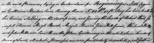 “Beginning at an old ash on John Hardy’s corner tree, then south 65 west 270 poles to a pine, north 25 west 320 poles to a pine, north 65 east 320 to a pine on Cashy Swamp, then the windings of the swamp to the first station.”