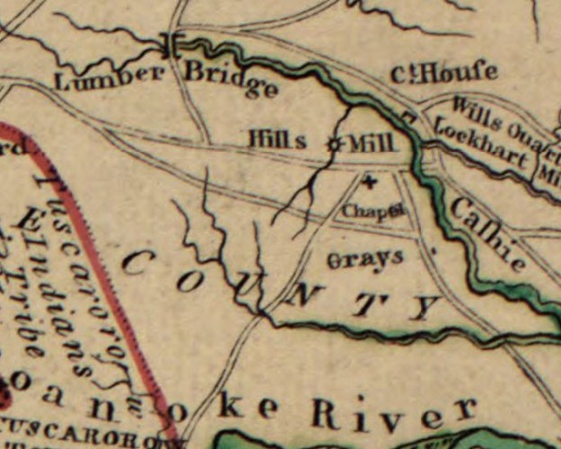 A year ago, I graphically overlaid a topographic map with the plat of a 700-acre land grant issued in 1786 to David Standley (seen outlines in red below). The piece of land ran miles down the Cashie Swamp and its original survey shows the names of adjoining owners (right). Of interest in this exercise, the survey also references the mouth of Connaritsa Swamp and historic Lumber Bridge which crosses Cashie Swamp between the communities of Snake Bite and Republican.  This was fun to see as I knew the tract could be graphically expanded or made smaller until the illustration correlated with known locations on topography maps.  The tract, being long with a bend south made me realize how accurate the surveyors were in the early days. Anyhow, related to this post, note in the image below that the southern-most end of the tract adjoins the lands of “John Hill,” just as David Standley’s survey suggests.