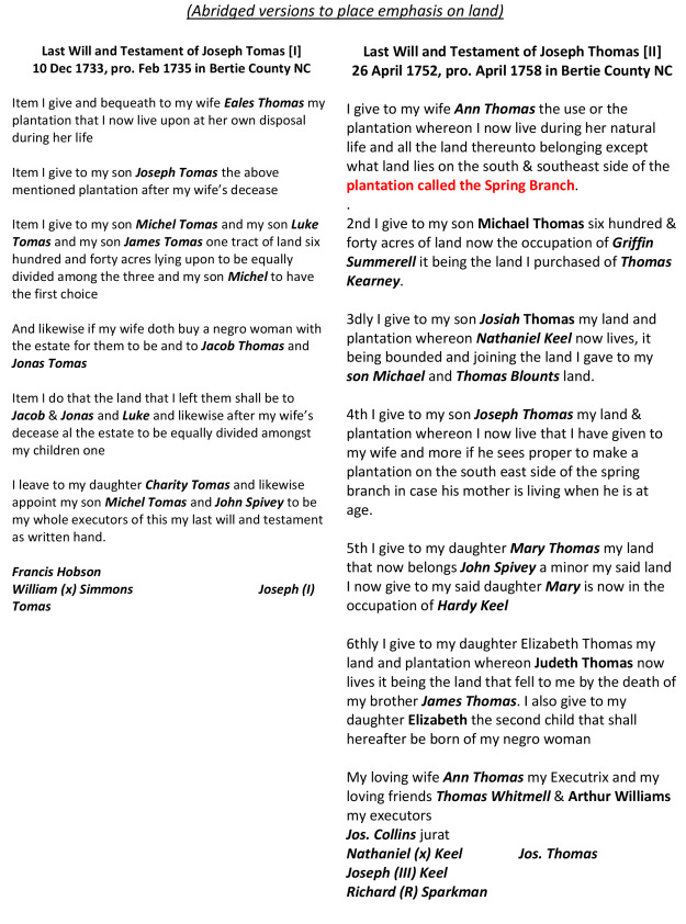 Hi Cynthia …and also enjoyed meeting and talking with you and others at the event. I honestly don’t adhere to genealogies going back beyond NC as there are simply too many missing records allowing for opportunities to get it wrong. I think such trees should include a greater use of the word maybe. Anyhow, There are two, at least, Thomas families in early Bertie. I met a fellow at the event who was Josiah who is surely from the lineage my family believes “may be” ours. Even in that belief there are no records at this time making our connection from Bertie to Wake. I think the family up near Askewville is the other family though Joseph in our lineage seems to have acquired land near Hope and then west of Woodville. That could be a matter of confusion between father and son of same name influencing how we interpret a 1735 will and one written in 1752. For now, I am heading to Charlotte with my mom today and will be out of pocket through early next week as we prepare for her birthday and niece’s baby shower in the mountains. Will look at what I have on your tree but may not be able to dig deeply till middle of next week.