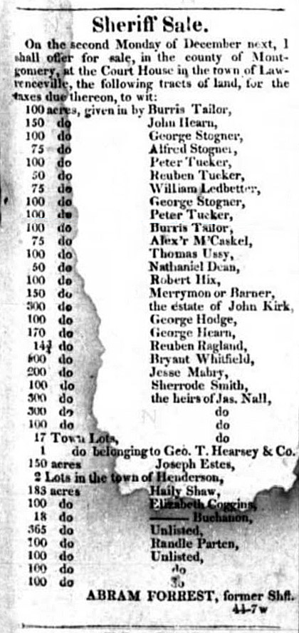 Curious to learn from any published use of the names Burris and Taylor within the confines of my North Carolina stomping grounds, I searched Newspapers.com where I came across the following 17 Nov 1826 notice by former Montgomery County Sherriff Abram Forrest concerning land being sold due to unpaid taxes. Published in the North Carolina Star (Raleigh NC), the sale represented serious business as much of the land was likely being sold because the folks listed were either dead, woefully in debt, or had moved beyond the county. Just as with naming patterns and how the miscommunication of their attribution can alter history, bits of information as found in this Sherriff Sale may be fraught with opportunities for error. I’ll delve into that broader aspect in my next post, but for now, do you see a name on the list below that might be significant for the Burris family? How about for the Taylor Family?