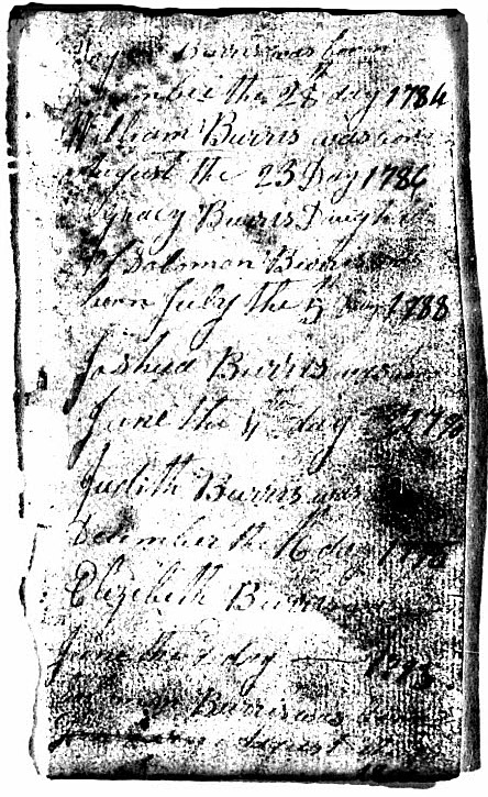 Solomon’s pension application includes the family’s record which names his son Taylor Burris born “December, the 28th Day, 1784.” See it to the left, at the top? This fact is used in support of the idea that Judith’s maiden name is indeed Taylor. And using more distant records, some wrongly assess Judith Burris as being the daughter of Robert and Mary Taylor out of Edgecombe County NC.