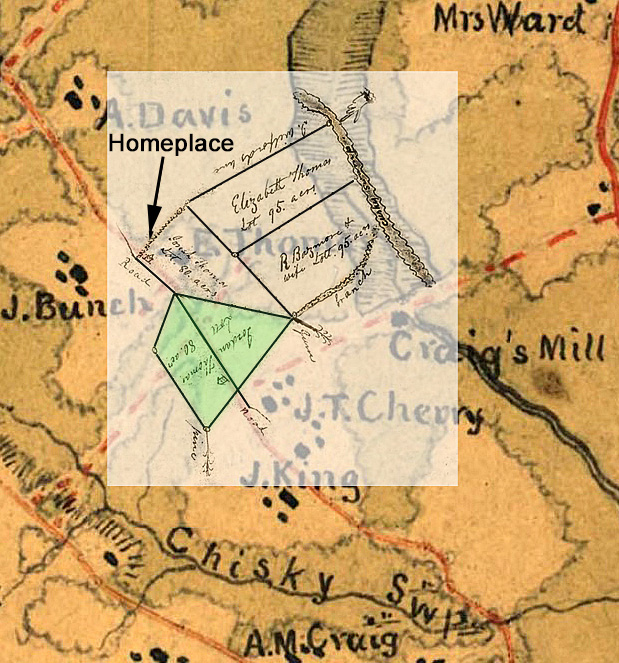 Note that Everett Thomas is the son of Josiah Thomas Junior who received the northwest-most tract from his father’s estate, including the homeplace. The homeplace is identified in both the estate division and the 1860’s Confederate Engineering Map which the division plat overlays.  In 1850, 45-year-old Everett Thomas is living in the home of his aged father, Josiah Thomas, who is 75 years of age. Next door in the census is Jeremiah Bunch [Junior] who is also identified on the Confederate map.