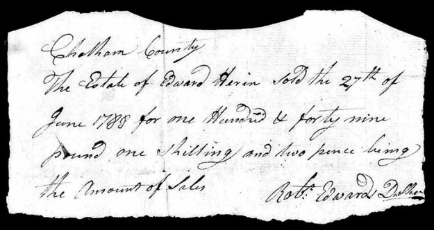 Two years later, in 1782, Edward Herrin was found ten miles to the north, where he received 150 acres (784, Wake) on Kit Creek near present-day Morrisville. Edward’s granted land adjoined Moses Herron’s, with Edward Herron Junior and Owen Herron serving as survey chain carriers. Ultimately, the Herrin family coalesced briefly to the north on the waters of Marks and branches of Kit Creek along the line between Wake and the extreme northeast corner of Chatham County. And then, in 1788, loose estate papers in neighboring Chatham County give notice of Edward Herrin’s Death: