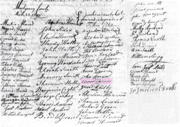 Also occurring in 1778, the same year Absalom entered land crossing the Wake and Chatham County line, Howell Harrod entered 282 nearby acres (1754, Orange) on the waters of Newhope Creek. Some show that Howell died locally though I believe he later moved west across the Yadkin River to Montgomery County, North Carolina, with his Uncle Absalom Harwood. There, both Absalom and Howell Harwood signed the 1799 petition concerning lands sought after for the benefit of UNC. I believe Howell eventually took off for Tennessee as he appears records there acquiring land in Stewart County. Supporting this idea, Howell’s entry in the entry book is close to others known to be rooted earlier in Montgomery County, North Carolina.
