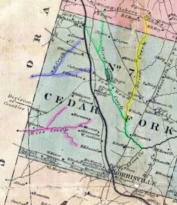 Now part of Durham County, as seen in the 1871 Nichols & Gorman map of Wake County, Township No. 7 was once home to numerous families ending up in Stanly County. Crabtree Creek, which appears on the eastern extent of the map (right), flows east across Wake County before joining the Neuse River near the town of Knightdale. The headwaters of Crabtree Creek are Brier Creek (yellow) and Stirrup Iron Creek (green), whose streams rise in the more recently developed land between Research Triangle Park and Falls Lake. Further west, beyond Crabtree Creek and a pronounced geological dividing ridge, the waters of Kit Creek (pink) meet up with Northeast Creek (blue) before making their way to the mighty Cape Fear River in Chatham County. It amazes me that Kit and Stirrup Iron Creek are only a mile apart in old Wake County, and yet, their waters are separated by more than a hundred miles of coastline upon reaching the Atlantic Ocean. It’s in this mapped area, near Morrisville, where much in this post is rooted.