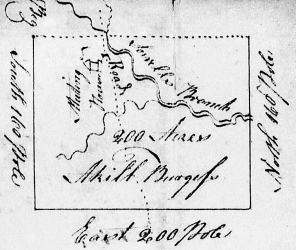 As for John Maynard, he received a land grant for 126 acres (1423, Montgomery) “joining his own, Thomas Motley, and Udy’s.” The granted land in Montgomery County was surveyed in 1801, at which time Younger “Wardrupt” served as chain carrier. John and a person named Thomas Maynard appear in the 1800 Montgomery County census, and then all goes quiet. However, a close look at the 1799 petitioners reveals signer Draper Burgess whose father, Achelly [Akel] Burgess, married second on 8 Apr 1779 to Sarah Mainer in Wake County. Sarah Mainer is John Maynard’s sister. Akel Burgess received a land grant (709, Wake) for 200 acres on Sorrell’s Branch “including the meeting house.” That tract adjoined Nathan Almond’s land with John Motley serving as chain carrier for the survey.