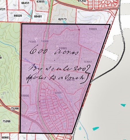 - Eli R. Herrin to M. F. Yorke, (21-364, Stanly), being 225 acres per deed of trust involving A. G. Freeman. Situated west of Big Bear Creek, this tract nicely abuts the abovementioned land. The northern end of this land (pink) adjoined Rowland lands while the southern end joined lands belonging to ——— Motley and John Eudy Jr.