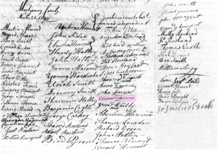 The Wardrobe/Waldrop and Almond Families. Phonetically the oddest of signatures in the 1799 petition is that of Younger Wardrobe (Waldrop) who appears in Montgomery County in 1790 and 1800. However, in ca. 1790, Younger was also in Wake County, where he is identified in estate documentation as purchasing from his deceased father’s estate. The son of James Waldrop, Younger’s family lived along Lick Branch and Brier Creek within the Northeast Creek watershed. As already discussed, Northeast Creek, a branch of Newhope Creek, rises west of the present-day Durham/Wake County line before emptying into Jordan Lake in Chatham County.