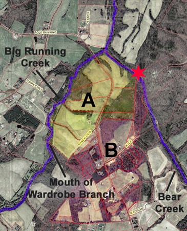 - Peter Cauble to John J. Cauble, (Deed 1-190, Stanly). Situated in the fork of two creeks, survey metes and bounds begin on the northeast corner of this tract (shaded yellow) at the red star on bank of Big Bear Creek. The survey’s first line runs northwest to the mouth of Big Running Creek and then up that creek “to the mouth of Younger Hardroup’s Spring Branch then up the various courses of said Branch about 4 chains” or 264 feet which is less than the length of a football field.