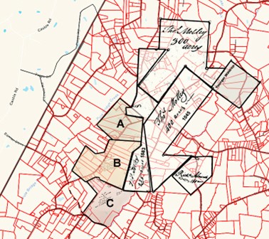 Back to Younger Wardrobe, the stream bearing his name provides an excellent memory though I wanted more. I was seeking to understand the early community better while platting land grants and deeds in the area; original ownership for the small waterway was revealed through happenchance alone. Platting tracts A, B, and C (below) and overlaying them atop the snazzy new Stanly County GIS map offered a reverse perspective from one of tracing today’s record back in time. The three deeded tracts, as seen below, are:
