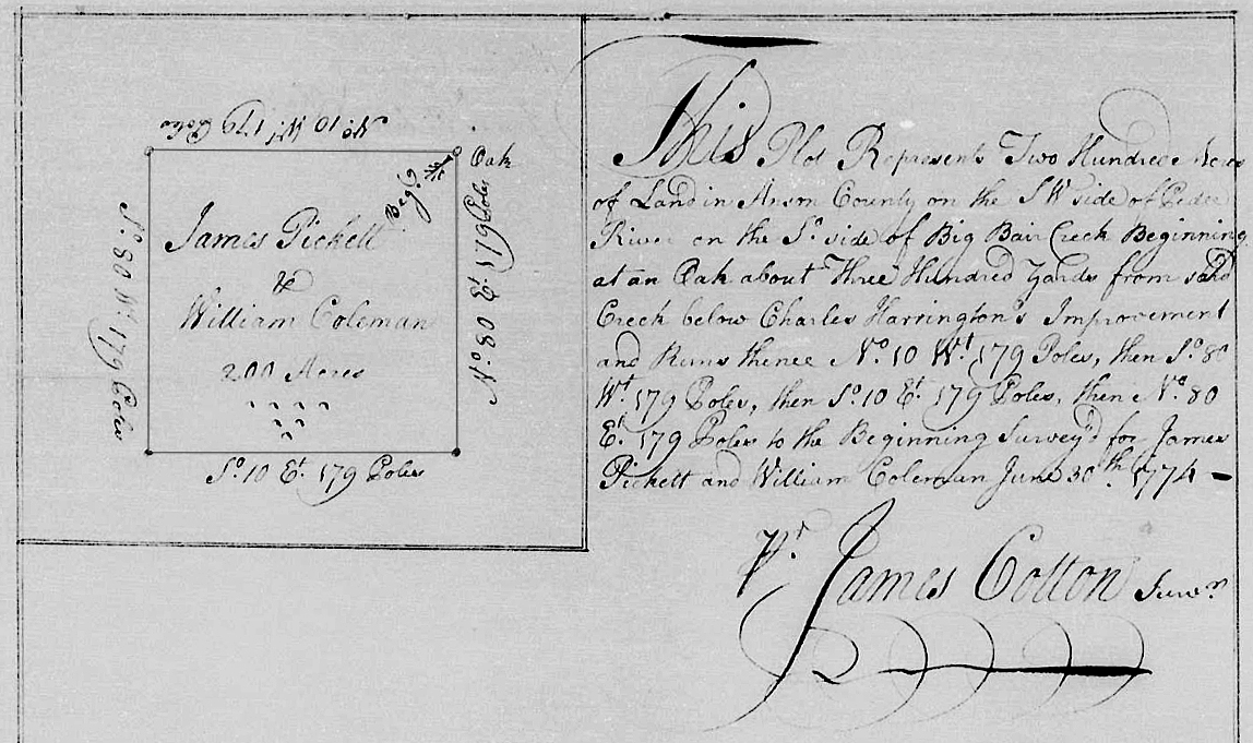 from said creek below Charles Harrington’s Improvement and runs thence No. 10 Wt 179 poles, then So 80 Wt 179 poles, then So 10 Et 179 poles, then No 80 Et 179 poles to the beginning surveyed for James Pickett an d William Coleman June 30th 1774. James Cotton, Surv’r