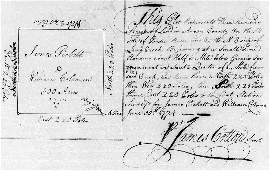 This plot represents three hundred acres of land in Anson County on the S. W. side of Pee Dee River and on the N. E. side of Long Creek. Beginning at a small pine standing about half a mile below Green’s Improvement and about a Quarter of a Mile from the said creek, and runs thence North 220 poles then west 220 poles then south 220 poles thence East 220 poles to the first station. Surveyed for James Pickett and William Coleman June 30th, 1774