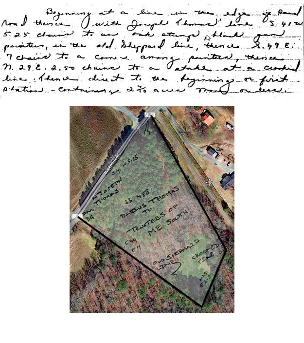 Below are the metes and bounds along with a plat I drew overlaid atop of the Google map. Though deeded in the 1800s, it is nice that the bounds are recognizable today.