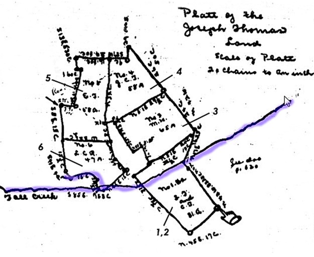 Purple line indicates Fall Creek and an unnamed branch, the mill dam and mill race. Tract 1&2 allotted to Lonnie and Catherine Thomas Tract 3 allotted to Malissa Howard Tract 4 allotted to J. Clyde Thomas Tract 5 allotted to Edgar Thomas Tract 6 allotted to L. C. Rosser.