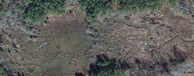 Zooming in using Google maps, one can study Fall Creek and the branch where once there was a lake roughly 6 chains or roughly 400 feet wide. The image below, looking in the area where the branch once flowed, pretty much identifies what could easily be the old lake and dam site.
