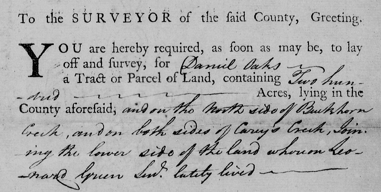 • Andrew Peddy Junr, file 920, being 200 acres adjoining Daniel Oaks on both sides of Cary’s Creek joining Andrew Peddy Senr. CC: Etheldred Jones, James Sellers.